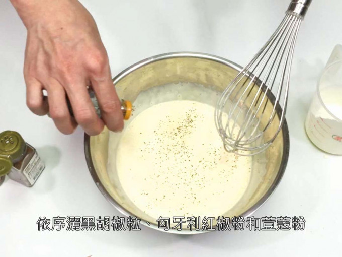接著依序灑入黑胡椒粒、匈牙利紅椒粉和荳蔻粉