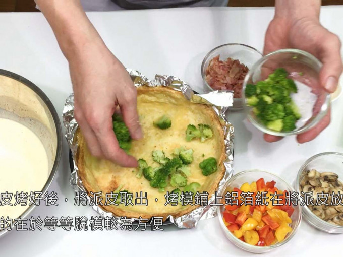 派皮烤好後放涼取出,再烤膜與派皮中間在墊一個鋁箔紙(方便烤好後取出鹹派),就可以把剛剛炒好的餡料裝填進去