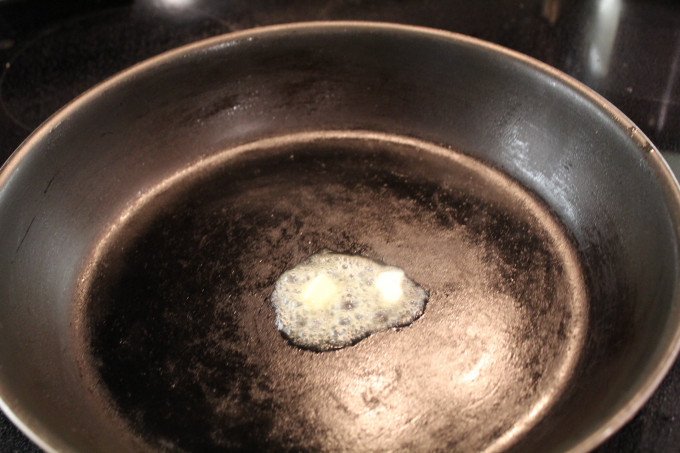 平底鍋加熱 中火 加入1/2 匙 有鹽奶油 融化