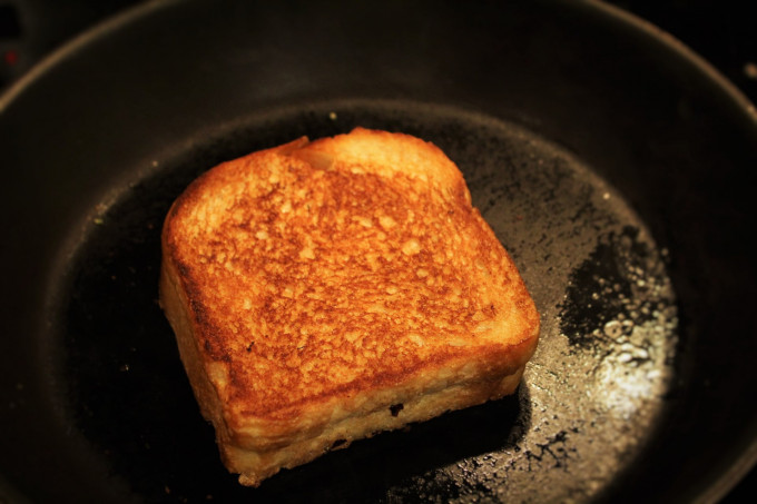 放上已夾入起司的麵包, 鍋鏟輕壓至底部金黃 翻面重複 1 & 2 動作.