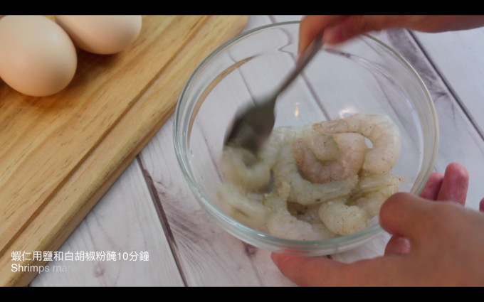 蝦仁用鹽和白胡椒粉醃10分鐘