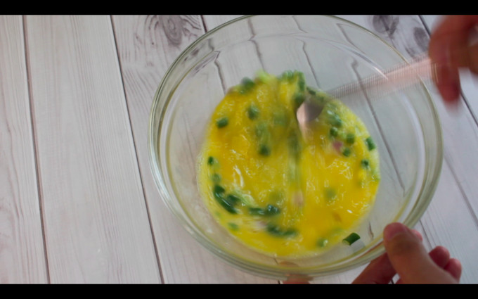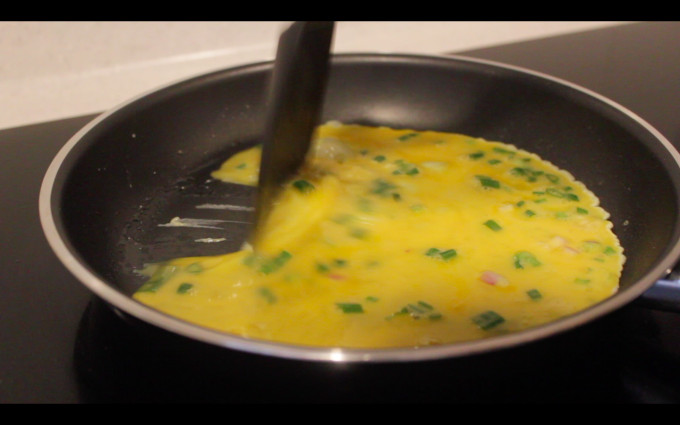 在鍋中加油,蛋液邊缘漸漸凝固後把蛋液往中間推