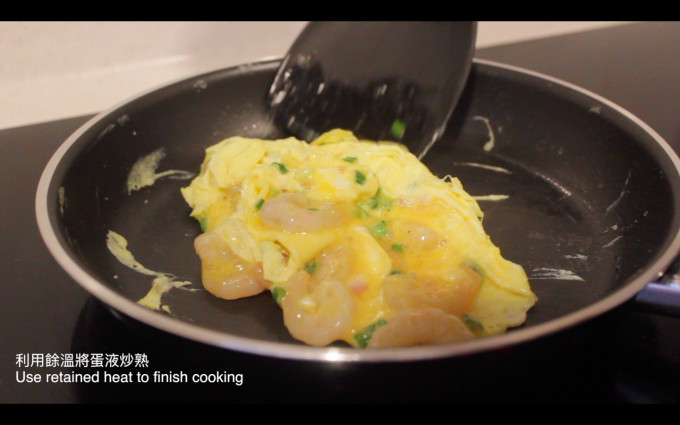 加入蝦仁後關火,等待蛋液凝固多一點後繼續炒,利用餘溫將蛋液炒熟 嚐樂 the joy of taste 影片:<a href="https://youtu.be/q8PR-EUeKCI" rel="nofollow noopener noreferrer" target="_blank">https://youtu.be/q8PR-EUeKCI</a>