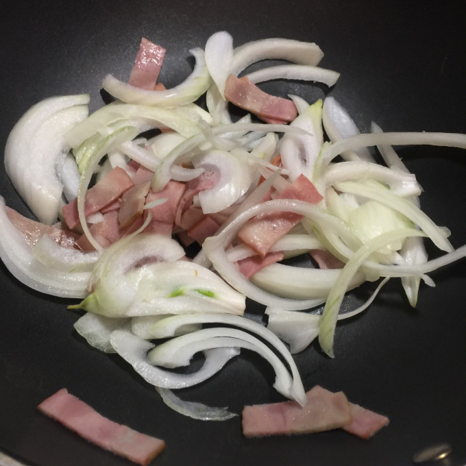 熱過後無需放油直接將培根放入, 以培根的油來將洋蔥炒軟