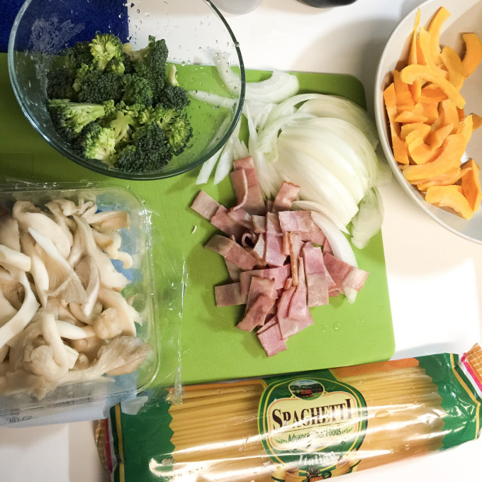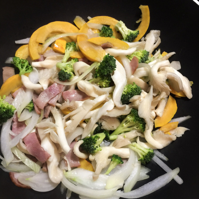 慢慢將秀珍菇、南瓜、綠花椰菜倒入拌炒,加一點熱水,蓋上鍋蓋稍微等南瓜熟