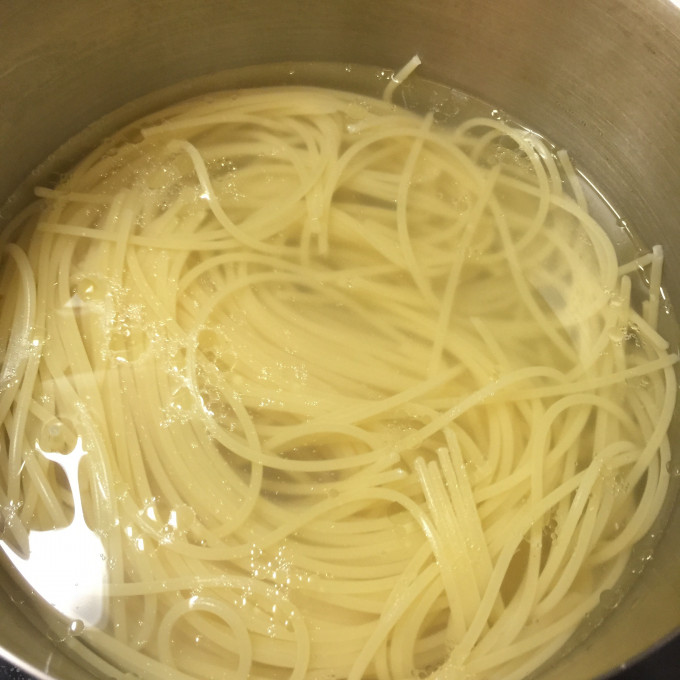 開一鍋水加少許橄欖油煮義大利麵,麵條煮至8分熟就好