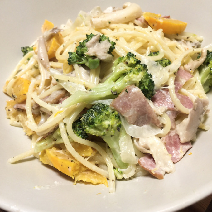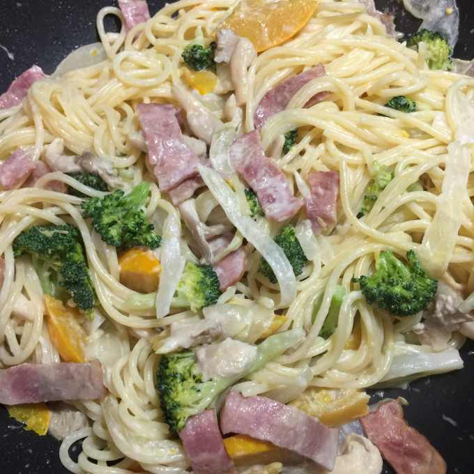 掀蓋後,將義大利麵撈過來,倒入鮮奶油、撒適量鹽、黑胡椒、義大利香料調味,拌炒,待稍微收汁後可盛盤