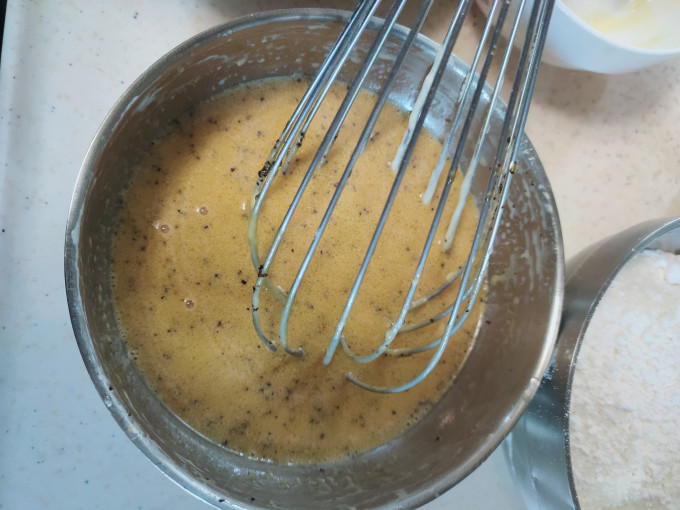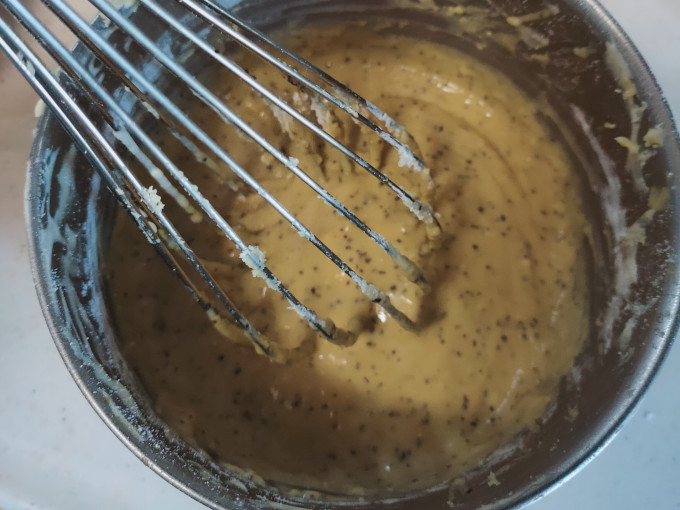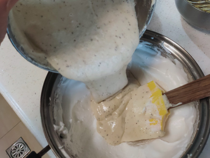 攪拌均勻後再倒入剩餘的蛋白糊,攪拌均勻