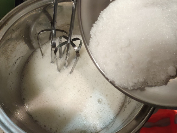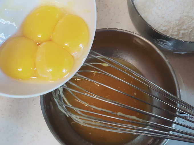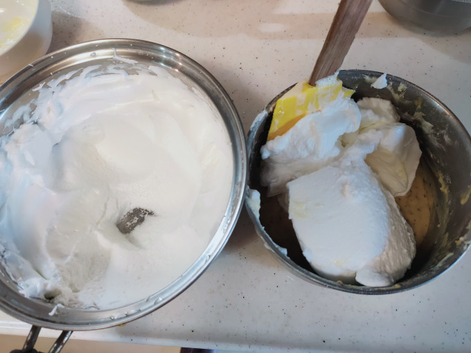 將1/3蛋白糊混入蛋黃糊攪拌均勻
