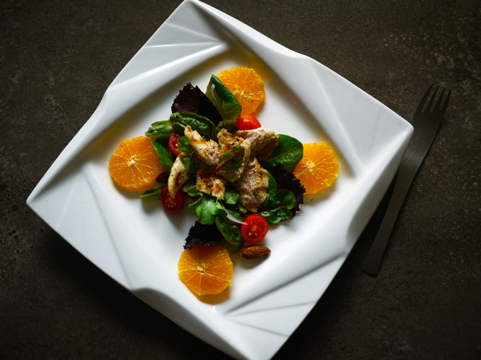 食材 : 雞柳, 橄欖油, 黑胡椒粗粒, 鹽, 香吉士果肉切片, 綜合生菜, 小番茄切片, 紫洋蔥切絲, 杏仁碎, 香吉士皮刨絲, 初榨橄欖油, 巴薩米克酒醋醬, 鹽, 大蒜切碎