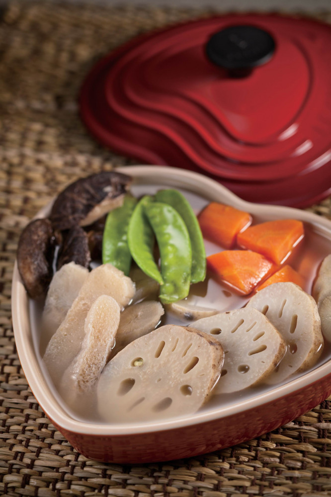 食材 : 蒟蒻, 紅蘿蔔/蓮藕, 牛蒡, 荷蘭豆, 冬菇, 蒜(剁茸), 葡萄籽油, 無味精雞湯, 老抽, 糖