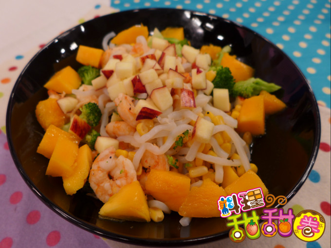 食材 : 蝦仁, 蒟蒻麵, 芒果, 蘋果(切片泡鹽水), 玉米粒, 花椰菜, 鹽巴, 高湯, 米酒, 黑胡椒