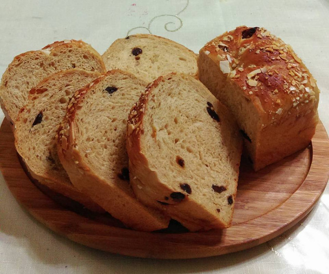 食材 : 黃僑高粉, 糖, 鹽, 酵母, 奶油, G7 三合一咖啡, 冰開水+蛋, 奶粉, 葡萄乾, 杏仁片(壓碎), 蜂蜜