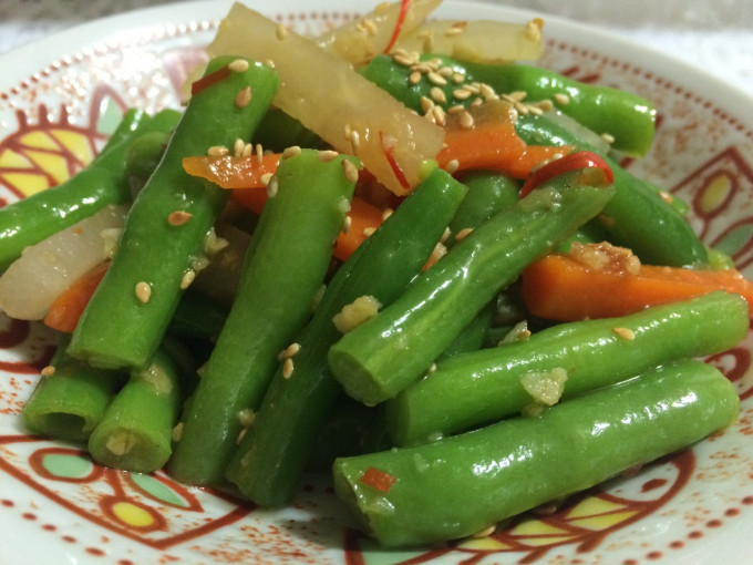 食材 : 四季豆, 紅蘿蔔(配色), 洋地瓜(配色), 蒜頭(拍碎), 紅辣椒(配色), 白芝麻, 調味料:香油, 糖, 醬油膏