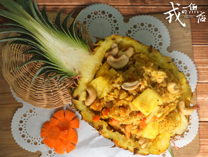 食材 : 鮭魚片(切丁), 鳳梨(切塊), 白飯, 蘿蔔丁, 洋蔥丁, 蛋, 腰果, 鹽, 魚露, 咖哩粉, 椰漿, 檸檬汁, 胡椒, 鹽