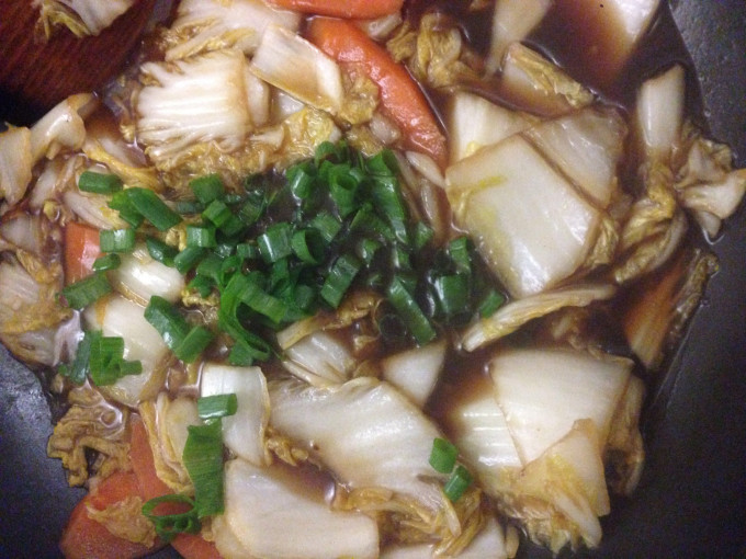 食材 : 大白菜, 紅蘿蔔切片, 蒜頭, 蠔油, 香油、白胡椒粉