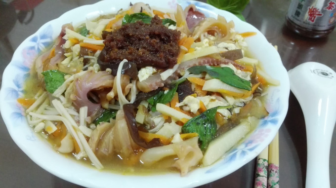 食材 : 乾魷魚, 胡蘿蔔絲, 筍絲, 黑木耳切絲, 蒜頭切碎, 九層塔, 柴魚片, 雞高湯, 沙茶醬, 鹽, 糖, 醬油, 白胡椒, 蓮藕粉或太白粉