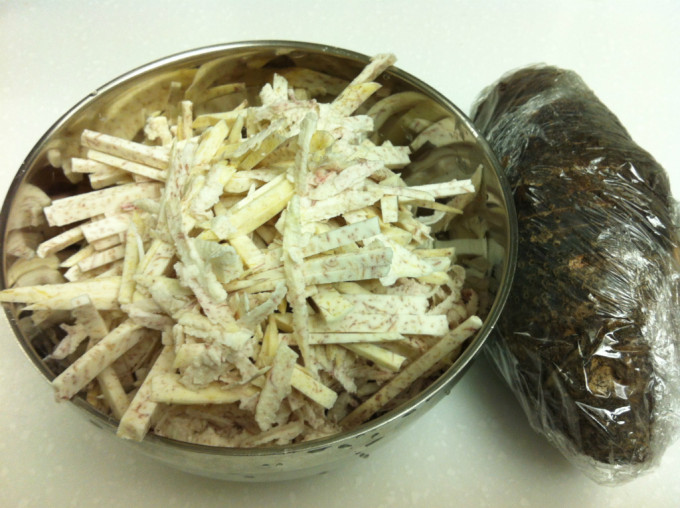 食材 : 在來米粉, 糯米粉, 芋頭, 蝦米, 紅蔥酥, 醬油、鹽、糖、胡椒粉、五香粉