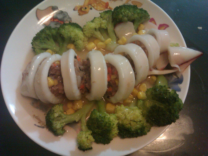 食材 : (醃料)胡椒鹽, (醃料)米酒, (醃料)太白粉, 花枝, 絞肉, 乾香菇, 玉米粒, 紅蘿蔔