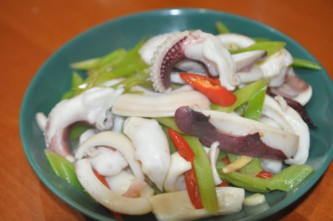 熱鍋加少許油,爆香辣椒和薑片,加入芹菜拌炒,加入花枝,30cc熱水,悶2分鐘,調味,若喜歡甜味,可以加上一些砂糖增添風味,鍋沿淋上烏醋嗆鍋,即可起鍋了