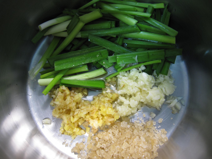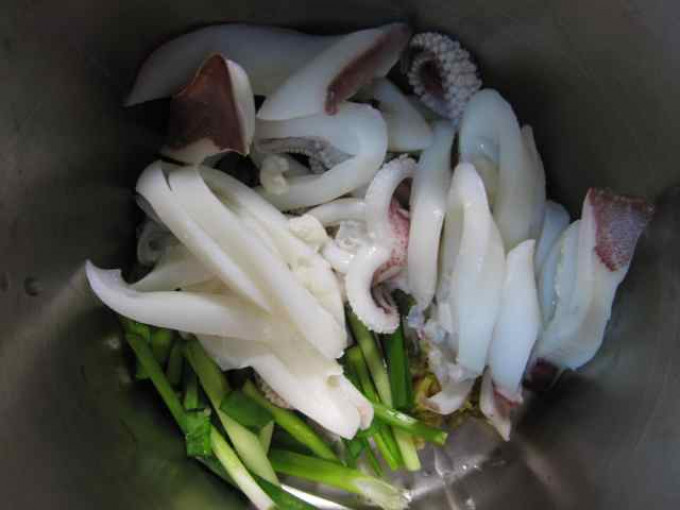 將久菜洗淨後,切成適當的長度後,連同蒜未與薑未一起放入鍋內備用。