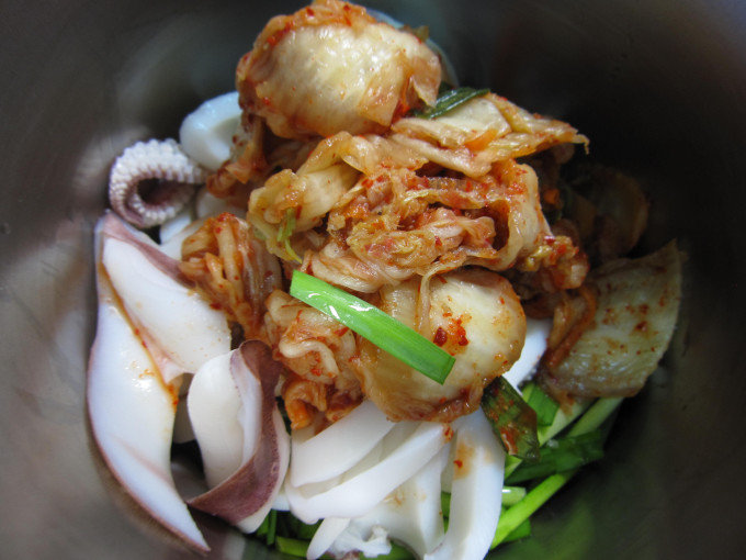 把韓國泡菜一樣的放入鍋內。(PS:若泡菜是整條或是太大塊的話,要切成適當的長度後再放入,讓整體的大小一致,避免影響口感。)