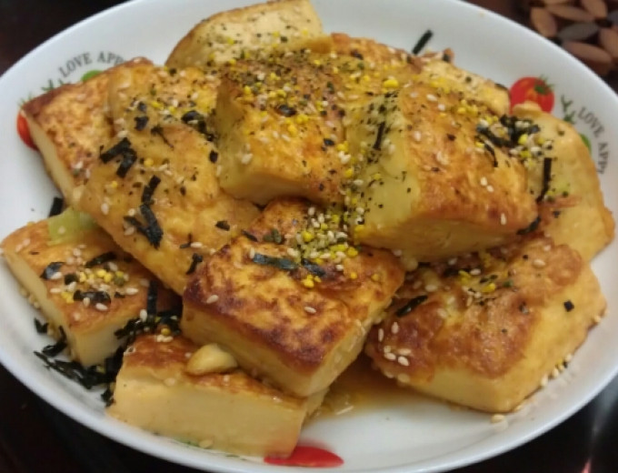 平底不沾鍋內加入2大匙油和少許鹽,開中火燒熱後,加入切成適當大小的雞蛋豆腐煎至一面焦黃後,再翻面煎另一面至焦黃。
