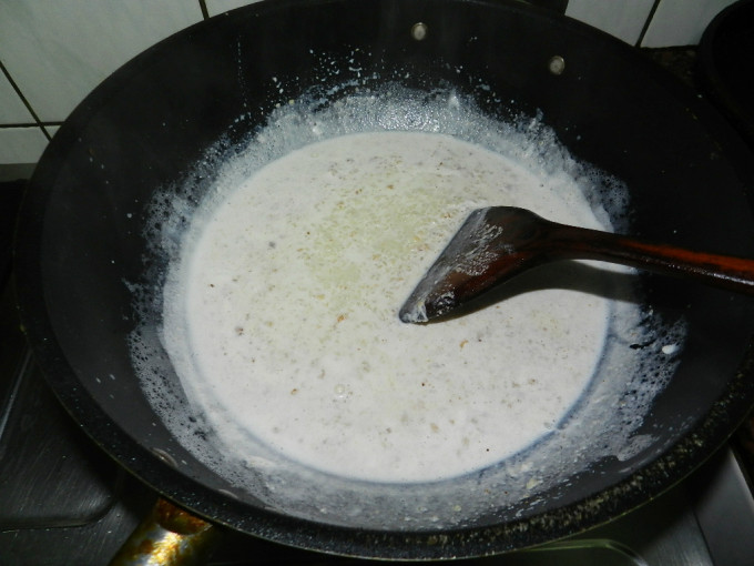 另外一杯鮮奶加入核桃打碎後,再倒入一起煮,並加入糖