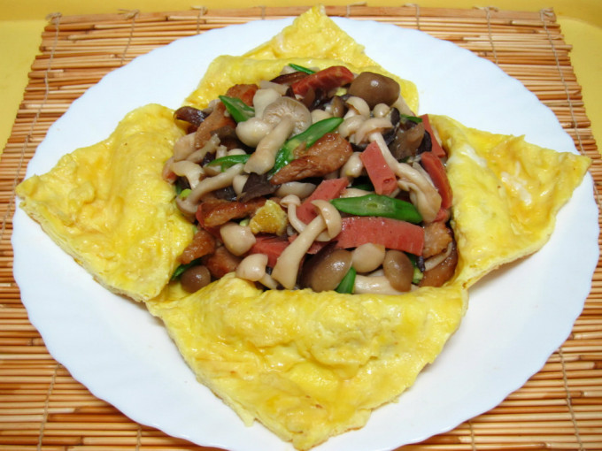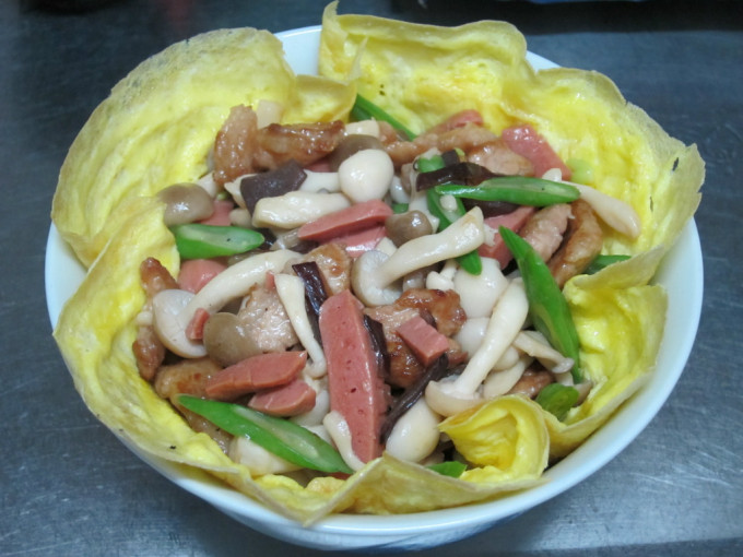 多餘的蛋皮往內摺,取一平盤放大碗上面。倒扣於平盤上即可。