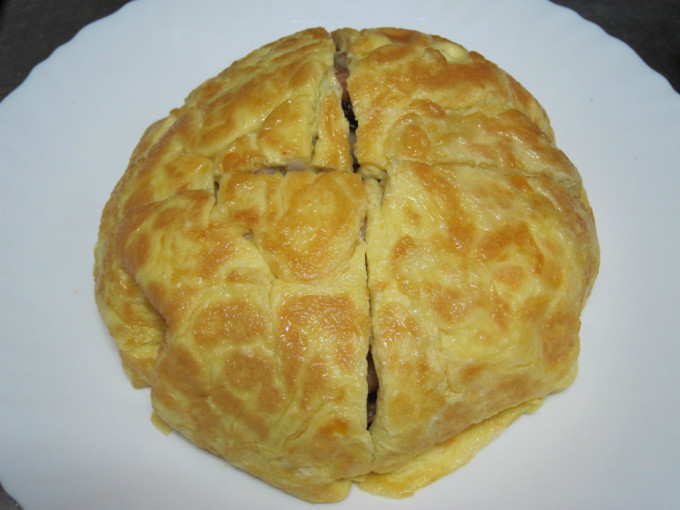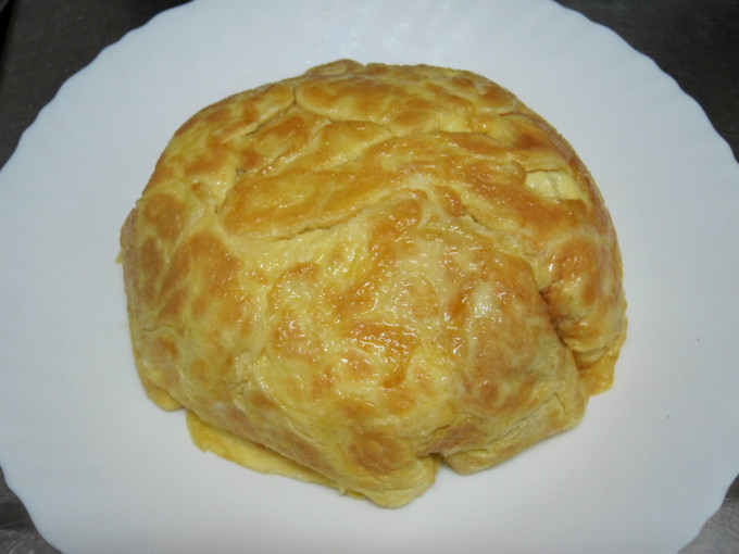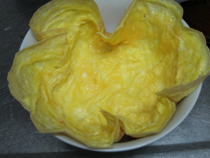 倒扣於平盤上即可,蛋皮就像一頂帽子般給戴上了。