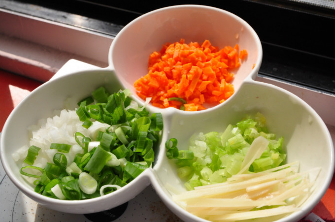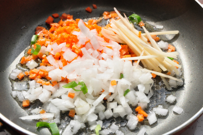 備鍋一大匙油加熱後,將配料下鍋翻炒爆香