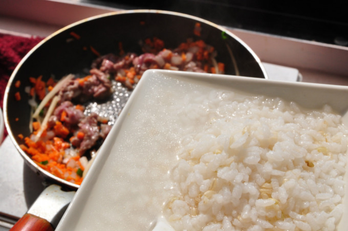 使用白米與糙米各半混合沖洗,放入電鍋滾煮