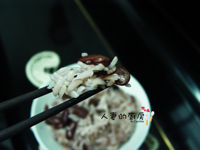 先將紅豆(大紅豆)泡乾淨的水一個晚上,早上起來後量二杯的大賀好米輕輕的洗淨後,加入泡好(要洗乾淨)的大紅豆,放一起,然後加入三杯的水,放電鍋前加一點的香油避免米粒沾黏~