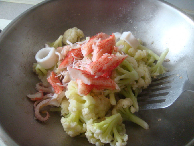 為了吸引不喜歡吃花椰菜的家人所以加了蟹肉棒跟透抽一起煮..
