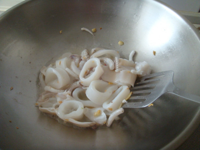 花椰菜洗淨川燙備用.透抽洗淨切好.起油鍋爆香蒜末.辣椒下透抽拌炒一下.加入米酒去腥