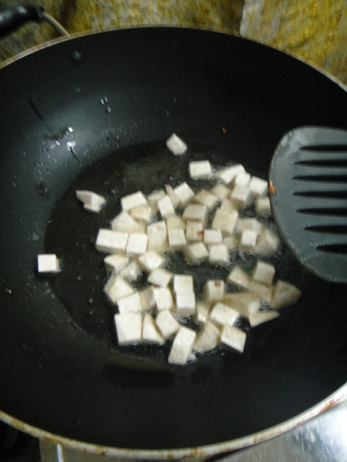 將切丁的芋頭放入鍋中油炸至呈現金黃後盛出