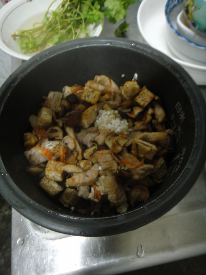 將炒好的料,放入飯鍋中和洗好的白米一起拌勻,再放入1又1/3杯水或高湯煮熟