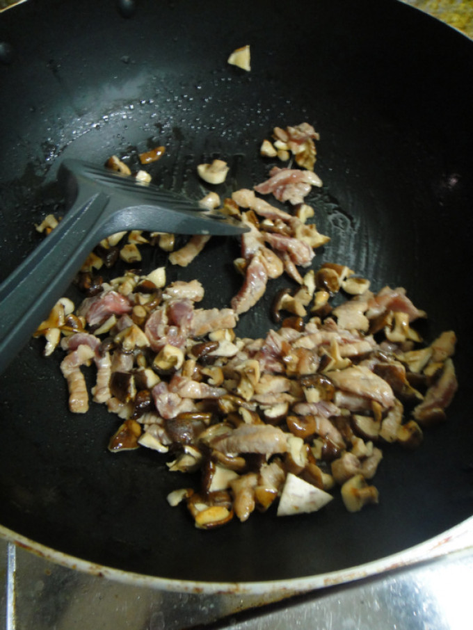 將香菇絲放入鍋中炒出香味,再放入醃過的肉絲拌炒至肉外表呈現白色狀,再加入櫻花蝦及炸過的芋頭炒,放入醬油及胡椒粉調味(使用水煮飯的話,醬油可以加多一點)