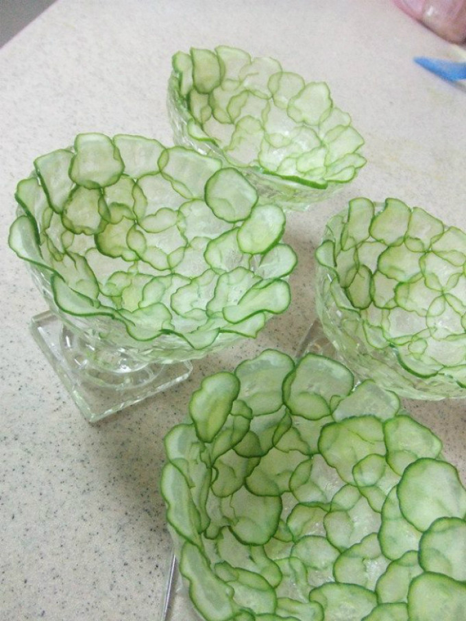 隔天,小黃瓜薄切,灑一小匙鹽,靜置10分鐘待出水。出水後洗淨擰乾。找寬口杯子(我用冰淇淋杯)由底部放第一片小黃瓜再由同心圓環繞至鋪滿整個杯子。