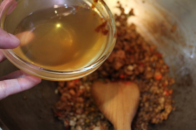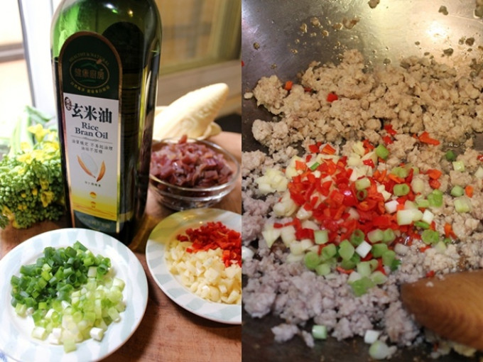熱鍋,倒入兩大匙的玄米油。待油熱後放入豬肉末轉中小火煸至表面成金黃色, 再倒入辣椒末和蒜末爆香...