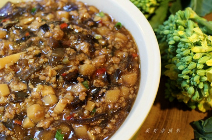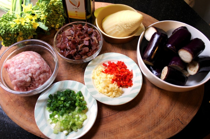 準備材料: 1.茄子切好用鹽, 白醋醃至出水 2. 將所有切成末