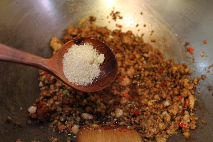 聞到蒜香時, 即可熗入翻炒均勻, 聞到醬香後放入糖...