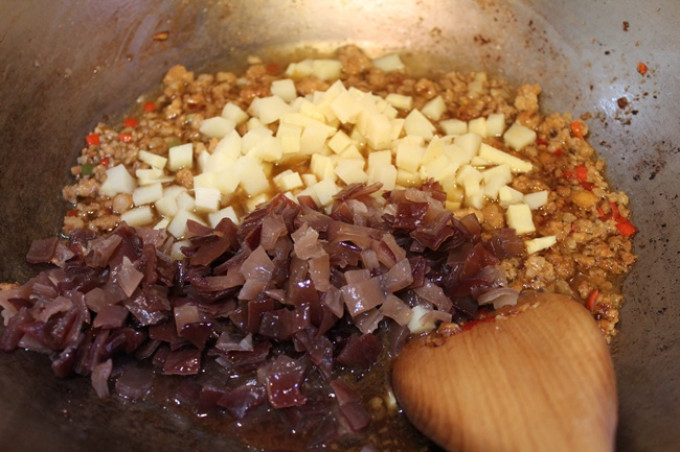 放入筍末和黑木耳...