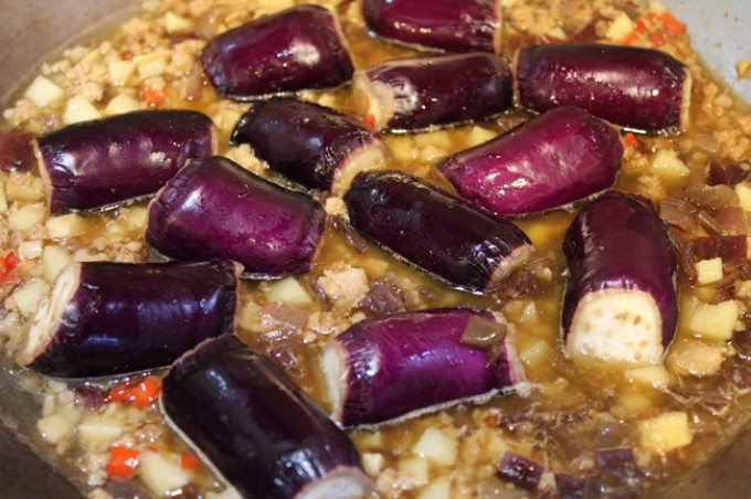 放入茄子, 蓋上鍋蓋轉中小火悶煮10分鐘! 起鍋前開大火, 太白粉水分三次倒入勾芡...