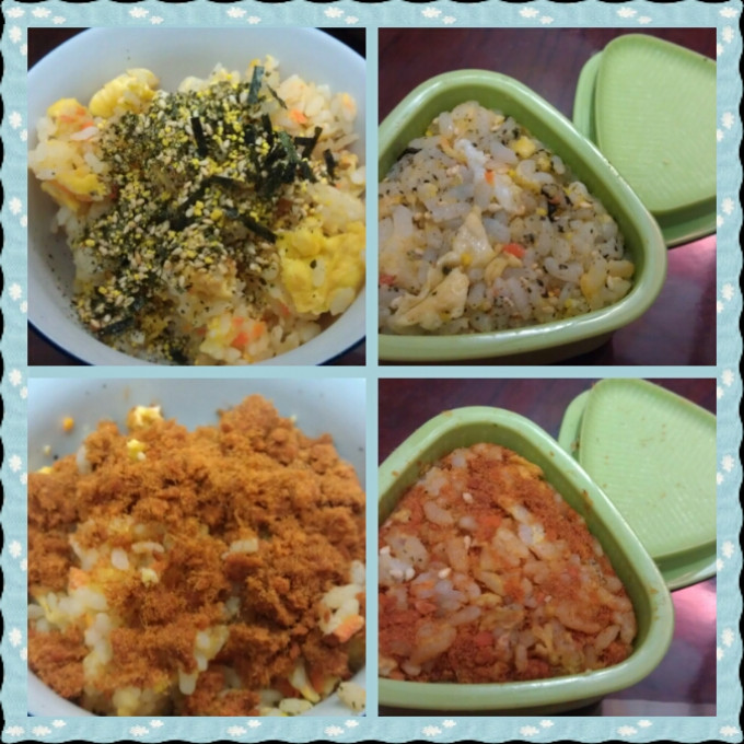 (上圖)中拌入海苔香鬆,再填入模型中壓出飯糰。 (下圖)中拌入肉鬆,再填入模型中壓出飯糰。