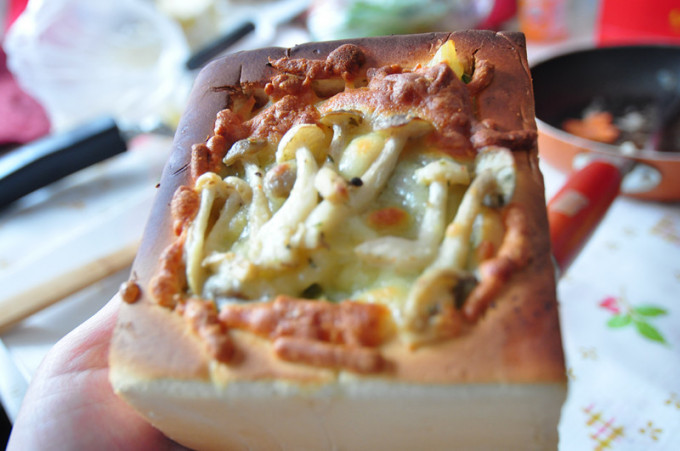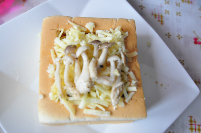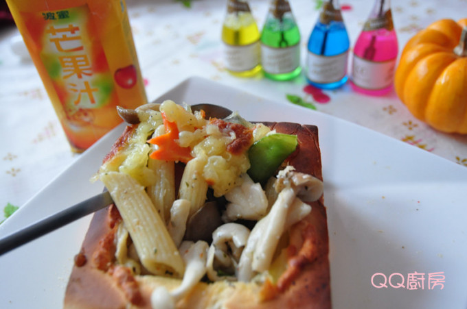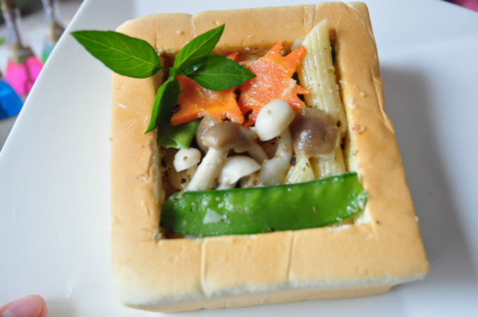將菇菇奶油麵放入吐司盒中,稍微擺飾..