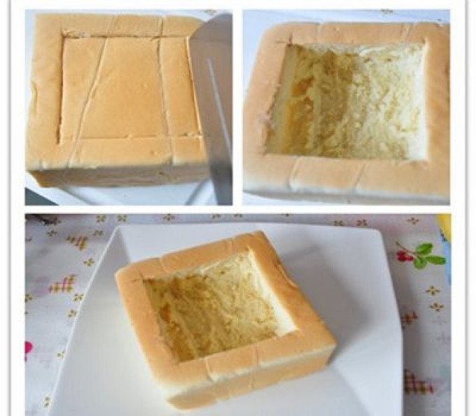 另將吐司盒,以刀子將四邊往內縮約1.5cm劃四刀,再以湯匙挖起成為一個四方洞