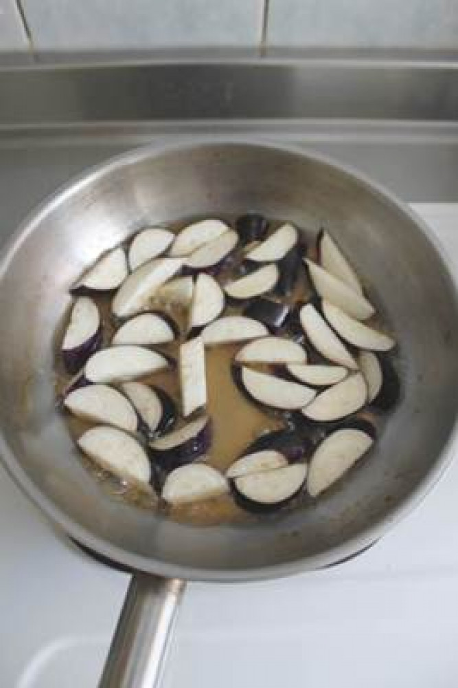 在煎鍋中放入所有調味料,煮沸後放入茄子煮至茄子變軟。