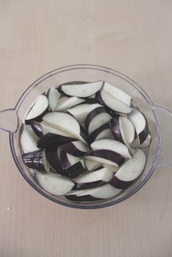 茄子對半切開斜切成大概1cm的片狀,浸泡水中濾去水份。
