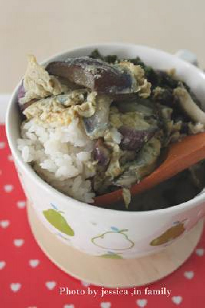 雞蛋半熟的狀態下裝入盛有飯的碗中,按個人喜好撒上切成絲的海苔。